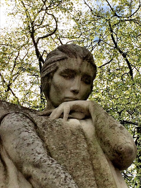 The over-lifesize figure, about 8ft high, stands head bowed, resting her chin on her hand, the elegant shape of which is a feature of the monument. Her other hand, in front of her, holds a wreath. She wears a simple shift, hanging straight down at the front, then to the side so as to expose her feet, and drape over the side of the base; drop folds to left and right provide a frame. Overall, the figure has a simple elegance and dignity.