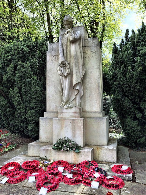 The memorial consists of shaped blocks forming a stepped obelisk of Portland Stone, some 13 ft high, in front of which stands a mourning female figure. There is no ornament on the obelisk at all, which in the spirit of the times, was thought a benefit.