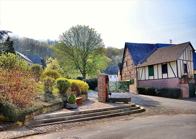 habt ihr einen Ausblick in die Ferne und seht unterhalb der Wiese ein Fachwerkhaus, welches schonmal komplett ausgebrannt ist.