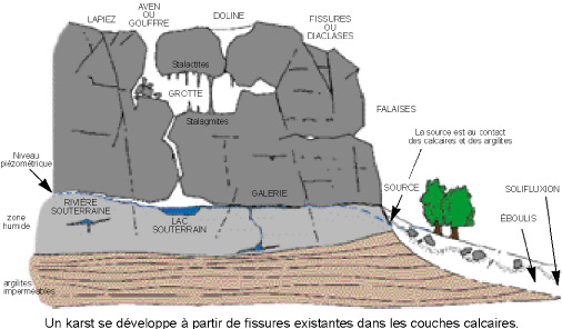 L'eau qui circule à travers les calcaires durs, par son action chimique, les dissout pour y sculpter des cavités pouvant être très vastes, développées à partir de zones fracturées.