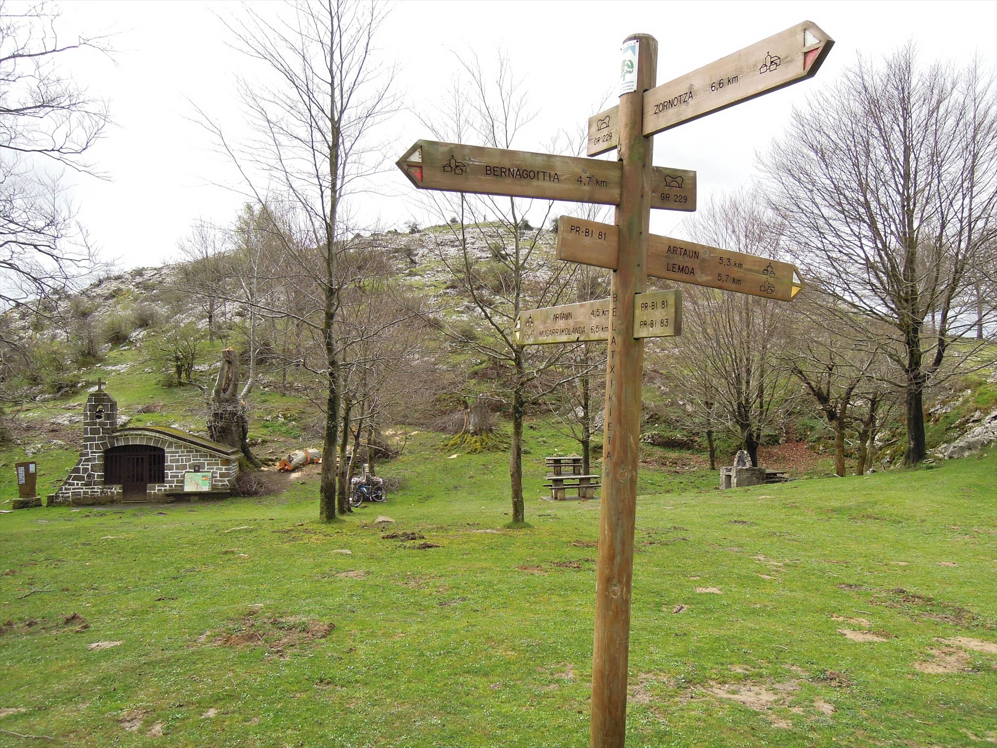 La cima de Belatxikieta (661m) se alza sobre la ermita y se alcanza con mucha facilidad. Es la única cumbre herbosa de la sierra de Aramotz, y está marcada por 3 buzones y un gran mugarri (piedra vertical de señalización).