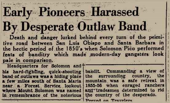 The Solomon Hills are named after Salomon Pico, the 19th century Mexican Californio patriot and bandit. Pico and his bandit gang lurked in these hills and ambushed men riding through who were carrying saddlebags full of gold intended to buy herds of cattle. It is rumored by many that Pico buried a fortune in stolen gold somewhere amongst these very hills!