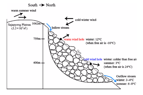 여름철 Talus 돌밭 위쪽 바위틈새로 부터 유입된 따뜻하고 건조한 공기는 돌더미 내부에서 냉각되어 Talus 돌밭 아래쪽 바위 틈새에서는 차고 습한 공기로 흘러나온다. 한편 이 차고 습한 공기가 따뜻하고 건조한 외부 공기와 섞이는 바위틈새 바닥 부근은 물의 갑작스러운 증발에 의해 더욱 냉각되므로 얼음이 형성된다.