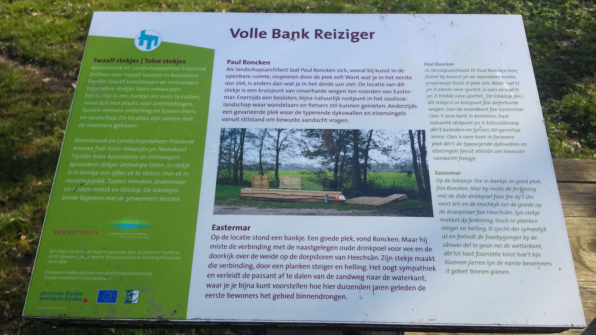 Ontwerper Paul Roncken miste op deze locatie een verbinding met de naastgelegen oude drinkpoel voor vee en de doorkijk over de weide op de dorpstoren van Heechsân. Zijn stekje maakt die verbinding, door een planken steiger en helling. Het verleidt de passant af te dalen van de zandweg naar de waterkant, waar je je bijna kunt voorstellen hoe hier duizenden jaren geleden de eerste bewoners het gebied binnendrongen.