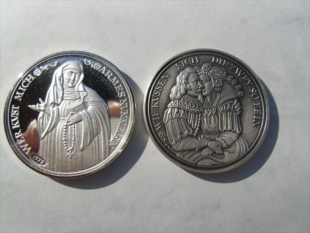 Der Kusstaler zeigt auf der einen Seite Casimir mit seiner 2.Ehefrau und der Umschrift „Wie küssen sich die zwei so fein“ und auf der Rückseite seine 1.Ehefrau als Nonne mit der Umschrift „Wer küsst mich armes Mägdelein“