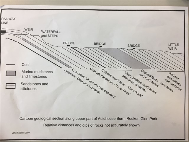 Stage 4 - Downstream a little from the Orchard Beds between the second and third bridges, look up to the top of the gorge. On the opposite side of the burn, a coarsening upward sequence is nicely exposed, with thinly interbedded siltstones at the edge of the burn, passing up into thinly bedded sandstones at the base of the cliff, under the overhang, and up into a massive sandstone forming the overhang itself. This section represents a transition from fully marine, offshore sedimentation (muds and limestones) to terrestrial floodplain sediments, and finally the sandstone. These sandier rocks were formed as rivers brought increasing amounts of sand into the sea.