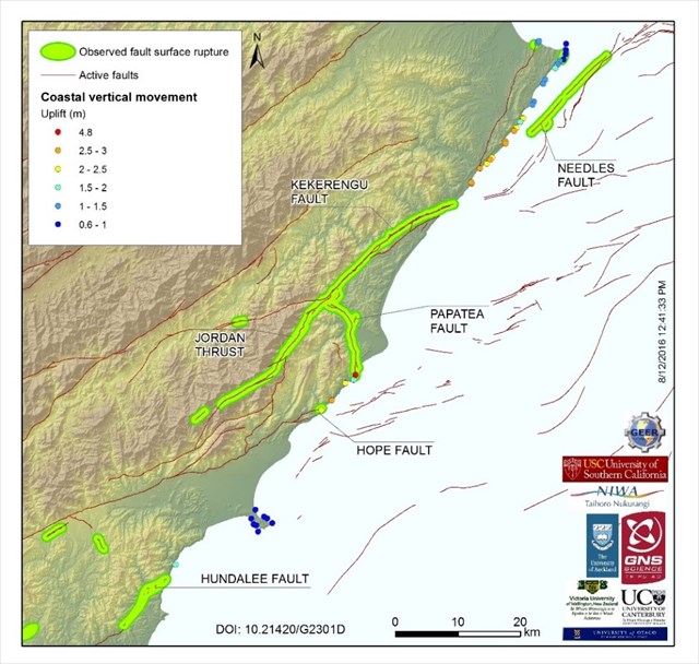 The earthquake on 14th of November 2016 with a magnitude of 7.8 resulted in a coastal uplift and some vertical movement along the fault line (where the plates meet).