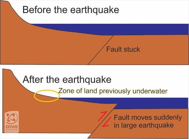 Coastal uplift is when the land is raised above the sea by tectonic forces. It can happen gradually over geological timescales or suddenly by an earthquake. When such vertical movement on a fault happens near the coast, the land is raised above sea level. Sea level is a powerful horizontal marker for measuring tectonic movement because it is very obvious which land used to be underwater before the earthquake.