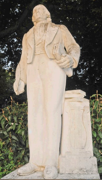 Alfred de Vigny La sculpture d’Alfred de Vigny a été réalisée par le douaisien Alexandre Descatoire en 1897. En pierre de taille, elle présente l’écrivain debout tenant une plume et un livre à la main. Sur le côté, une lyre rappelle qu’Alfred de Vigny, figure du romantisme français, était également poète. Alors qu’il était lieutenant, il aséjourné pendant une dizaine d’années dans plusieurs garnisons, dont Cambrai. Placée depuis mars 1958 en haut du nouvel escalier donnant dans la rue du Maréchal de Lattre de Tassigny, la sculpture attire le regard vers le jardin public.