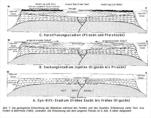 Die Inselwelt der Malediven (Abb. 5, 6) ist ein Teil eines mehr als 2 km dicken Flachwasserkalkpakets vor allem tertiären Alters, welches auf vulkanischem Untergrund liegt. Die erdgeschichtlichen Vorgängen lassen sich im Einzelnen wie folgt nachvollziehen (Abb. 7):