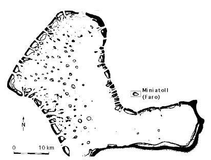 Abb. 6: Die Atolle der Malediven, wie hier das Felidu-Atoll sind überwiegend aus Miniatollen, den sogenannten Faros zusammengesetzt. Aus PURDY & BERTRAM(1993), verändert.