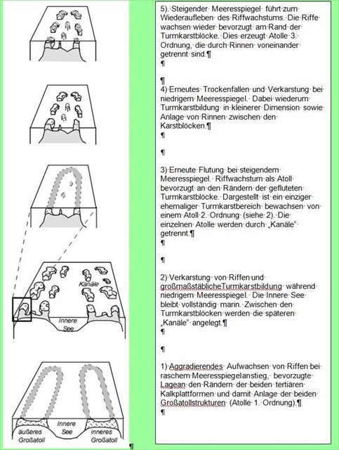 Spätpliozänes Trockenfallen der äußeren und inneren Kalkplattform führte zu einer Süßwasserlinse und entsprechender tellerförmiger Verkarstung. An den Rändern der beiden Teller wuchsen dann bei steigendem Meeresspiegel bevorzugt Riffe, was die Anlage der beiden ehemaligen Großatollstrukturen ergab. (Abb. 8, 1 ) . Bei der nächsten, durch Meeresspiegelfall bedingten Verkarstung lösten sich die Riffe insbesondere zu großen Turmkarstblöcken auf (Abb. 8, 2). Bei der Flutung dieser Blöcke bildeten sich Riffe wiederum bevorzugt am Rande, so dass sich kleinere Atolle bildeten (Abb. 8, 3), die in ihrer Anordnung die beiden früheren Großatolle nachzeichneten. Fielen diese kleineren Atolle trocken, bildete sich wiederum Turmkarst (Abb. 8, 4), an dessen Rändern sich bei der nächsten Flutung noch kleinere Riffatolle (Miniatoll, Faro) bildeten (Abb. 8, 5). Die durch die Innere See getrennten ehemaligen Großatolle haben sich also zu zwei Ringen von kleineren Atollen (z.B. Ari, Male, Felidu-Atoll) umgebaut. Die kleineren Atolle bestehen ihrerseits wiederum aus Ringen von Miniatollen (Faros). Und so sieht es heute auf den Malediven aus (vgl. Abb.5, 6)!