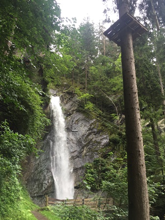 Nach Beantwortung aller Fragen geht es jetzt weiter den Holzstufen folgend quer durch den Hochseilgarten zum Wasserfall. Vorsicht, Euch begegnen vielleicht Menschen im Flying Fox, sie könnten auch in Autorreifen klettern, auf wackeligen Holzbohlen Halt suchen oder sie hängen in Netzen. Spektakulär wird es, wenn Ihr zum Wasserfall kommt. Hier rauscht vielleicht ein Kajak über Eure Köpfe oder eine Klettergruppe besteigt gerade die Steilwand neben dem 30 Meter hohen Wasserfall. An der Brücke bildet sich oftmals eine „Weiße Gischt“, die auch Namensgeber für diesen Cache ist. Die Gischt ist übrigens das weißliche Wasser-Luft-Gemisch, das entsteht, wenn das Wasser durch mechanische Einwirkung z.B. durch den Fall aus großer Höhe, aufgewühlt wird.