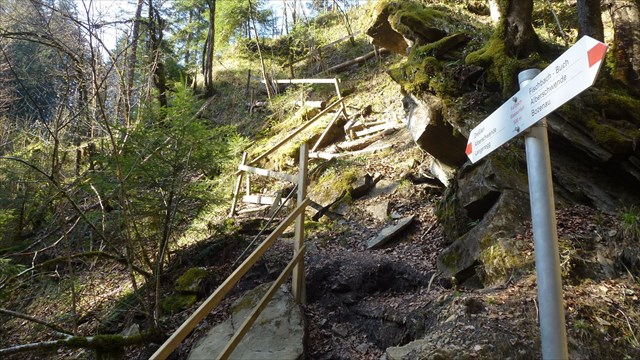 Bitte das Terrain beachten - dies ist definitiv kein Halbschuhweg!!! Im untersten Teil ist der Weg auf beiden Seiten der Schlucht sehr steil, führt zum Teil über hohe Tritte und kann rutschig sein, deshalb auf trockenes Wetter achten. Auf der einen Seite sind die gefährlichen Stellen mit Stahlseilen, auf der anderen mit Geländer gesichert. Mit trittsicheren Kindern kann der Weg durchaus begangen werden, sie sollten aber im untersten Teil gut beaufsichtigt bzw. an der Hand geführt werden!