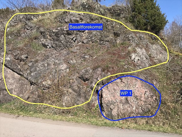4: Ved WP 1 ) er det en mer rødlig bergart (Granitt), kjenn med hånda di på enkelte steder og beskriv hvordan den føles (Glatt, ru, sandpapir, forvitrende etc). Hvorfor tror du denne bergaren føles slik?