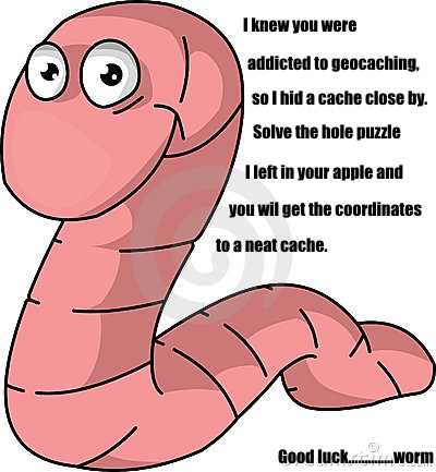 Hubby and I went on a picnic. I packed all the important stuff, like Peanut Butter & Jelly sandwiches, chips, beans and an apple for each of us. And of course an ink pen, just in case there was a cache in the park. Well, I opened the basket and we enjoyed our lunch until I pulled out the apples. Handed one to hubby and got mine and then I looked at it. It was filled with lots and lots of holes. Then I saw a note at the bottom of the basket.