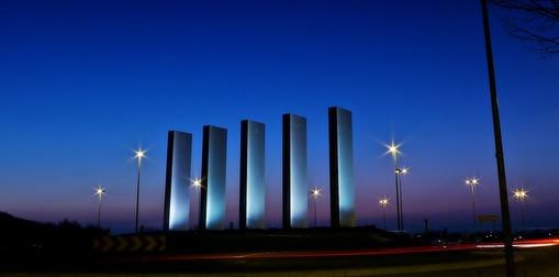 Der vom Künstler Klaus Hollenbeck auffällig gestaltete Kreisel, fünf Aluminiumbarren angeordnet auf einem Hügel aus grober Grauwacke Symbolisieren die Unternehmensphilosophie von Hydro.