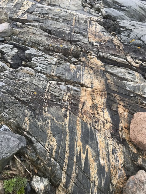 3: Ved WP 2 er det helt klart en annen mye mørkere bergart. Hvilken bergart tror du dette er?