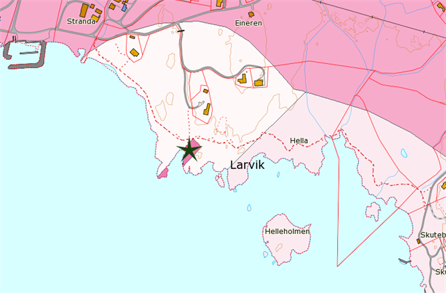 Ved oppgitte koordinater kan du observere Dioritt som den lyse (hvite/grå og av og til litt rødlige) grovkornede bergarten sammen med den mørkere Larvikitten. De røde områdene er mer fremtredende ned mot vannkanten. (Se bilde under)