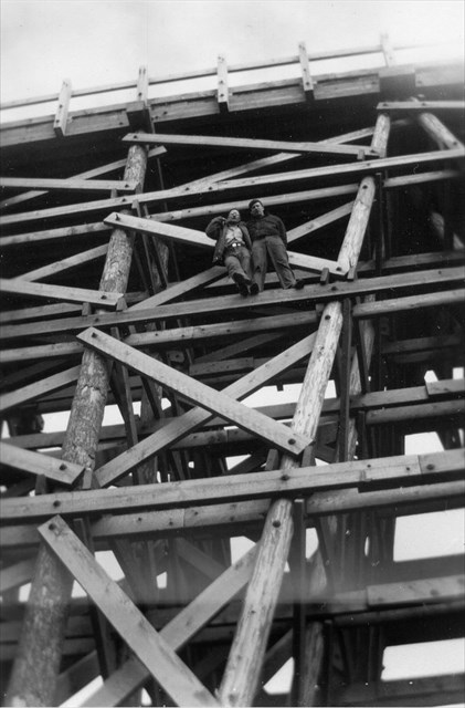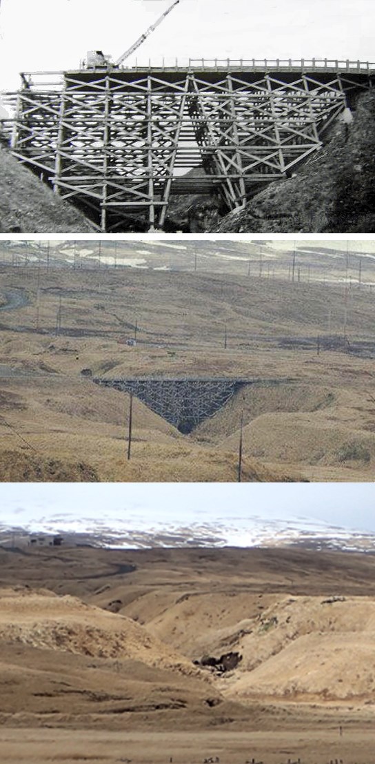 Toothpick Bridge was constructed during WWII, when within a few short, frenzied months the island of Adak went from being an uninhabited wilderness to a forward operating base for the Aleutian Campaign. The bridge remained in use throughout the Cold War but was eventually condemned, sometime in the 1980s. The photos at left, above, show the bridge being built in 1944, the way it looked from a distance--just like a bridge made of toothpicks--and the ravine today, with only a few scattered timbers and blocks to show where the bridge once stood. The photo at right, above, was taken by Fred Zalokoski or C.D. Schneider, soon after the bridge was built.