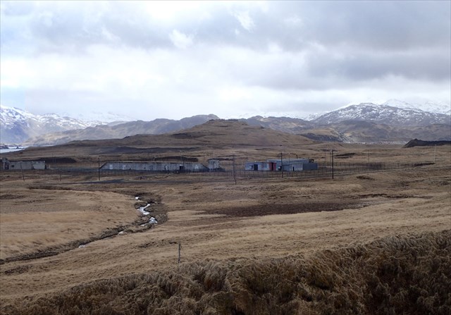 Nowadays anyone can visit what's left of the bridge. Guard rails block the remnants of road on either side of the ravine, and the tundra is gradually swallowing the last of the bridge's timbers. The north arm of Airport Creek chortles merrily at the bottom of the ravine, winding southeast to the MAUW Compound with its Seven Doors of Doom (photo below). On the flats to the east you can see the footprint of what was once a busy contractors camp, and the relatively new SuperDARN (Super Dual Auroral Radar Network) array. The hills to the southwest are in some years home to a shifting Aleutian tern colony.