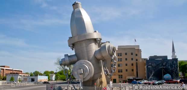 The Worldâs Largest Fire Hydrant roadside attraction can be found in Columbia, South Carolina. A quick stop off the interstate, this work of public art is worth a bit of a detour. The giant fire hydrant was constructed in 2001 by artist Blue Sky who was inspired when a car hit a fire hydrant in his yard, causing the hydrant to lean. This 40- foot tall attraction that weighs in at 575,000 pounds is officially dubbed âBusted Plugâ.