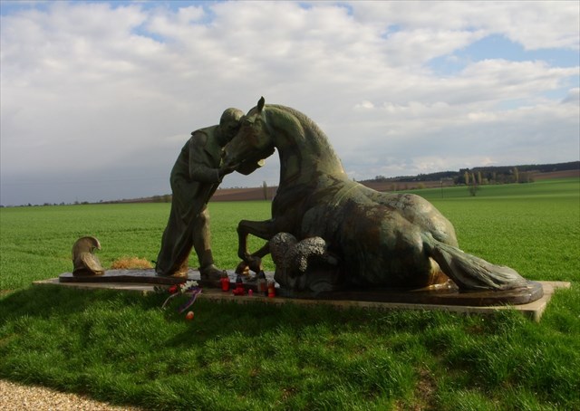 Komitét pro udržování pomníků na bojišti Královéhradeckém měl záměr postavit připomínku tohoto střetnutí již krátce po přelomu století. Byla vyhlášena sbírka, kterou se podařilo získat dost financí, byl zakoupen pozemek pro stavbu (právě ten, kde dnes socha stojí) a byly i vytvořeny příslušné návrhy a skici. Všechny přípravy na odhalení k 50. výročí bitvy ale přerušila 1. světová válka. Po vyhlášení samostatnosti ČSR zase výstavba pomníku nebyla možná z politických důvodů - jednalo by se o nežádoucí připomínku nenáviděné monarchie. Až v roce 2009 dostala myšlenka na důstojné uctění všech padlých lidí i zvířat reálné obrysy. Nejde však o realizaci původních plánů na památník, jedná se o nové umělecké ztvárnění vztahu jezdce a jeho zraněného koně. Komitétu 1866 se postupně podařilo sehnat sponzory, dárce a dotace, a akademický sochař Petr Novák z Jaroměře pracoval na přípravě vlastní sochy. Díly sousoší jsou odlity a sestaveny z bronzu, rozměry jsou 6 x 1,5 m, s výškou 2,5 metru a hmotností 1135 kg. Sousoší se za významného finančního přispění Ministerstva obrany a Královéhradeckého kraje podařilo dokončit v roce 2016. Při příležitosti oslav 150. výročí bitvy došlo pak v červenci 2016 k jeho slavnostnímu odhalení.