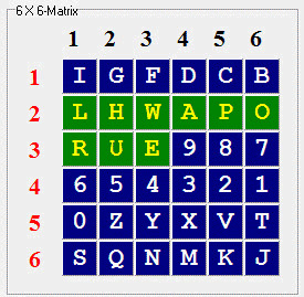 Das benötigte Substitutions-Keyword findest Du in dem Buch: Ottokar Domma - DDR-Gesamtausgabe (... die orangene!) Seite 46 Zeile 3 (ohne Überschrift gezählt) 7. Wort zuzüglich Seitennummer - die Matrix-Dimension beträgt: 6 X 6