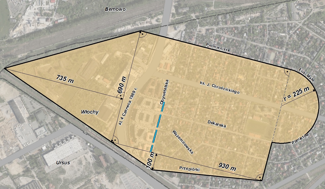 1. Our terrain is the western part of Nowe Włochy: the area limited by streets: Promienista, Łuki Małe, Pianistów, Rybnicka, Przepiórki, Świerszcza, Cykady. The following scheme illustrates it.
