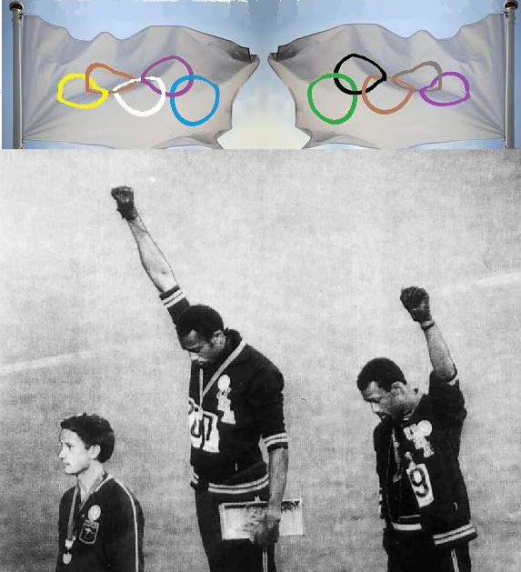 Bilden nedan, en av de mest ikoniska OS-bilderna, är från prisutdelningen efter finalen i 200 meter löpning i Mexico City 1968. Guld- och bronsmedaljörerna Tommie Smith och John Carlos höjer sina knytnävar under nationalsången, i motstånd mot de svartas situation, och för mänskliga rättigheter.