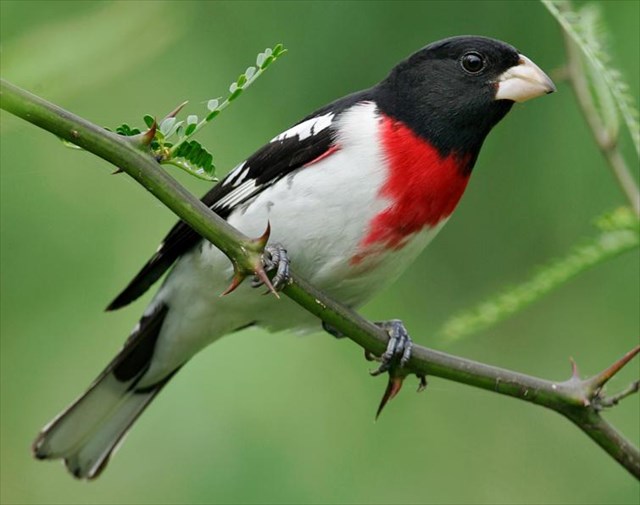Male Rose-breasted Grosbeaks (Pheucticus ludovicianus) are black-and-white birds with a brilliant red chevron extending from the black throat down the middle of the breast. Females and immatures are brown and heavily streaked, with a bold whitish stripe over the eye. Males flash pink-red under the wings; females flash yellowish. Both sexes show white patches in the wings and tail. These chunky birds use their stout bills to eat seeds, fruit, and insects. They are also frequent visitors to backyard bird feeders, where they eat sunflower seeds with abandon. The sweet, rambling song of a male Rose-breasted Grosbeak is a familiar voice of eastern forests; their sharp “chink” calls are also very distinctive. Rose-breasted Grosbeaks breed in moist deciduous forests, deciduous-coniferous forests, thickets, and semiopen habitats across the northeastern United States, ranging into southeastern and central Canada. They gravitate toward second-growth woods, suburban areas, parks, gardens, and orchards, as well as shrubby forest edges next to streams, ponds, marshes, roads, or pastures.