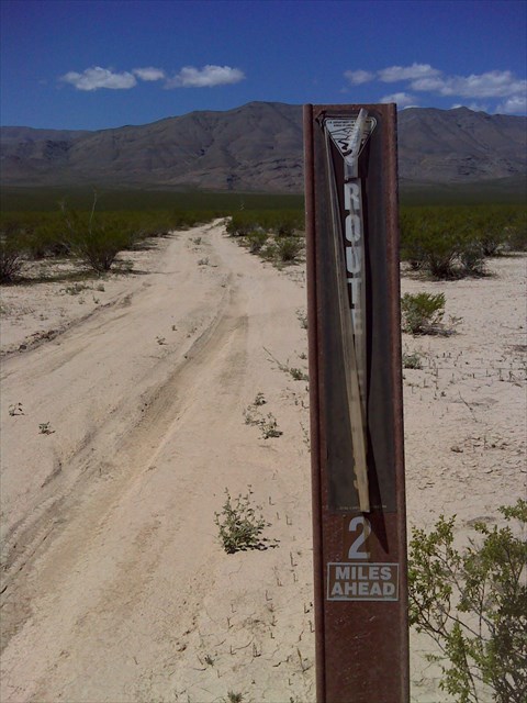 As the sign says, the road ends 2 miles ahead (once you leave the pavement), and the hide location is a little farther in to the desert, past the end of the road.