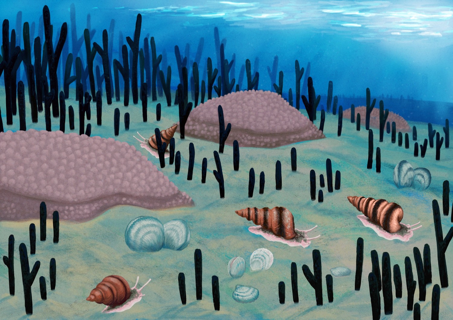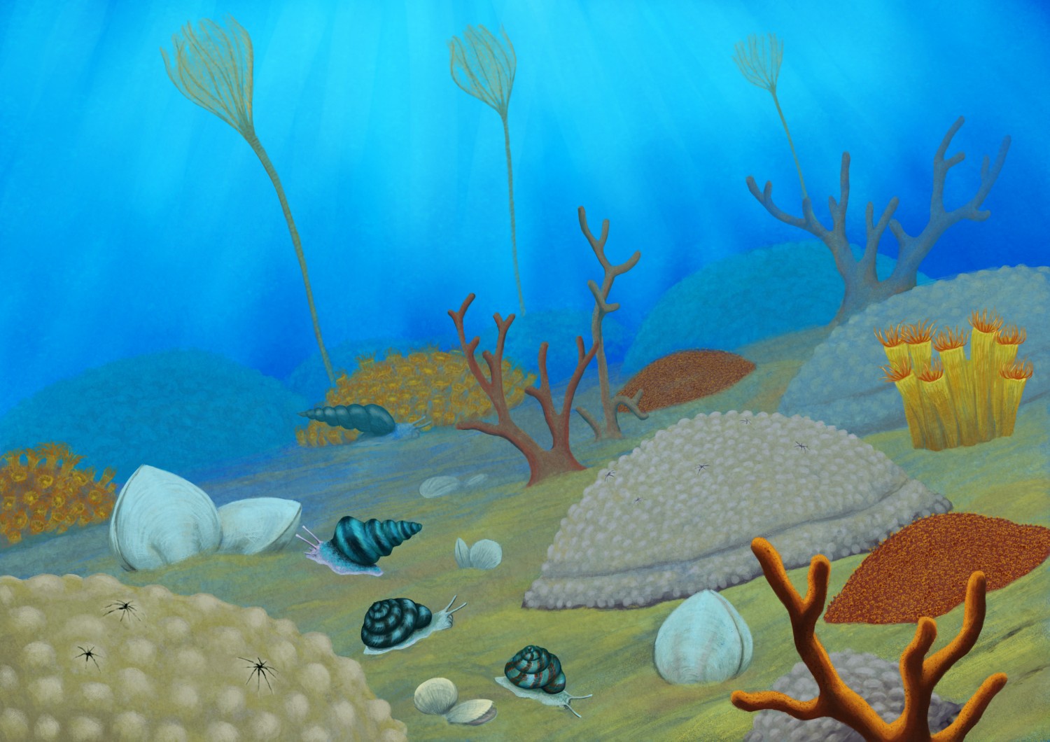 Płytkie morze dewońskie. Pionowe gałązki to amfipory. Kopulaste kształty to stromatoporoidy. Widoczne są również ślimaki oraz muszle ramienionogów. Płytka laguna miała nie więcej niż metr głębokości.