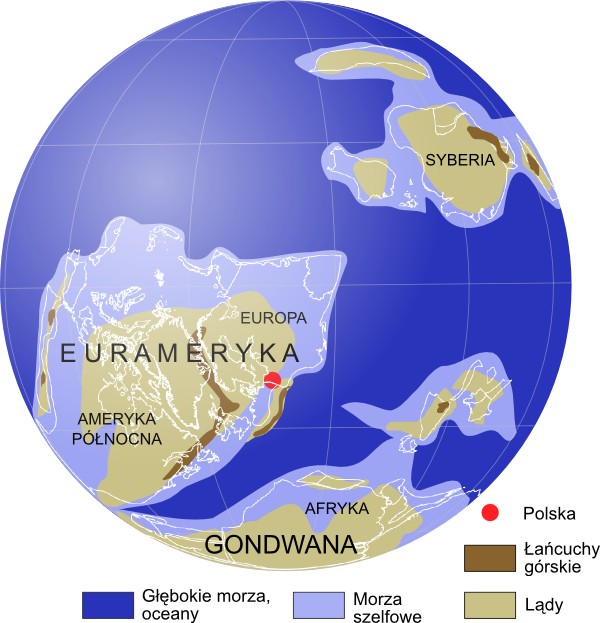 Znajdujemy się w miejscu, w którym kiedyś będzie Polska. Jesteśmy na prakontynecie o nazwie Eurameryka leżącym pod równikiem na południowej półkuli.