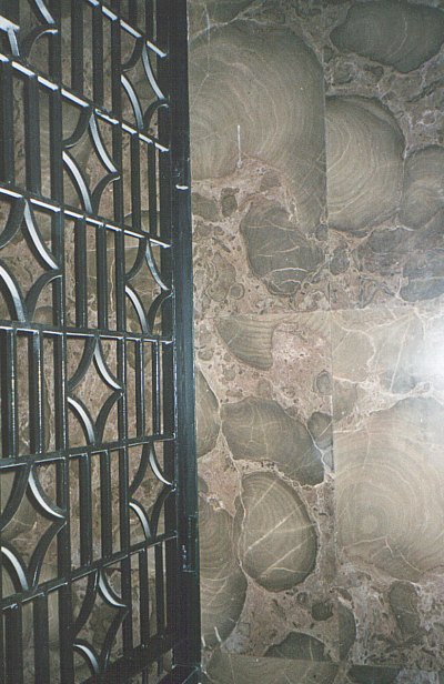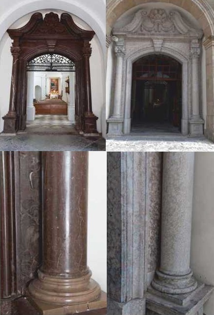 Przykłady zmieniania się skał węglanowych na skutek wietrzenia. Po lewej stronie elementy niezwietrzałe, znajdujące się wewnątrz budynku, po prawej stronie zwietrzałe, wystawione na działanie czynników atmosferycznych.