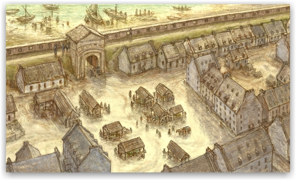 Au Faubourg Québec, on retrouve des vestiges archéologiques de la fortification et du quartier militaire : entrepôts, casernes et magasins du Roi. Érigée en 1709, la « canoterie » du Roi, affectée à la construction des canots, a fait l’objet d’une fouille archéologique. |