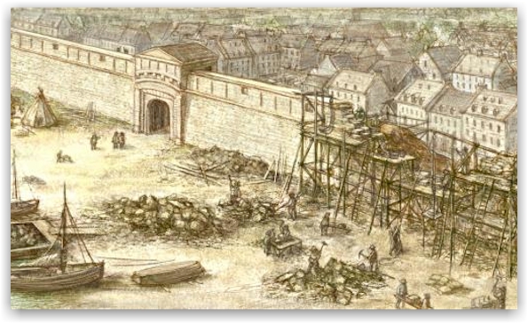 Les vestiges de la fortification au bastion du Gouvernement et de la résidence du gouverneur de Vaudreuil (1723-1803) sont marqués au sol. La porte du Gouvernement a été percée dans l’axe de la rue Saint-Charles, ouverte dès 1672 (place Jacques-Cartier est). À l’époque, un talus escarpé longeait la rue Saint-Paul. |