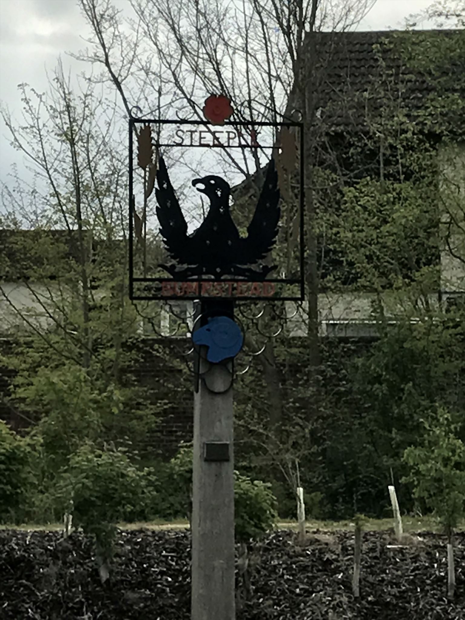 A Moot Hall, known as ‘the Old Schole’, symbolises Steeple Bumpstead and is recorded in the Domesday Book. In the 1830s, when it was ‘a school for farmers’ sons’, the villagers forcibly took possession of it, disputing the claim of George Gent of Moyns to have the right to appoint the headmaster. Eventually an ecclesiastical court upheld the villagers’ claim.