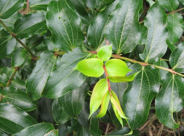 The leaves are dark green and shiny in two rows all along the branches, giving it a similar appearance to a fern. The leaves are 5-10 cm long and 4-5 cm wide, with pointed tips. They have prominent veins. The underside of the leaf is dull rather than shiny. The spring growth is very lush and a lighter green. It is the sap from this spring growth that is particularly poisonous.