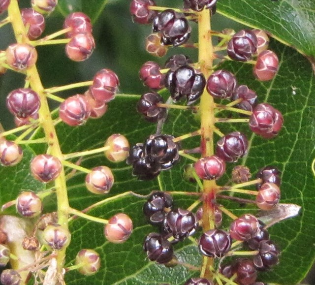 They are followed by black fruits with fleshy ‘petals’ around them, once again hanging in long racemes. Each fruit encloses several of the highly poisonous seeds.