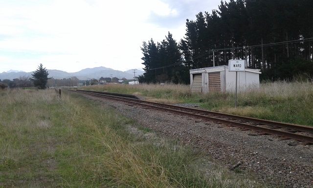 The huge Flaxbourne sheep station, which owned all the land from Lake Grassmere to the Clarence River, was purchased by the government then subdivided and sold by ballot on 26 June 1905. Part of that property was developed into Ward township that same year, and Ward railway station was opened when the line was completed in April 1910. Ward station was closed for passengers in March 1981 and fully closed five and a half years later. Now the shelter shed is gone, but the platform is still reasonably intact, although grass is growing through the tar seal surface. The building you see on the platform there is an equipment garage.