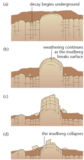 L'inselberg è un sollievo forte, alte decine di metri a più di 500 metri, si affaccia su un pédiplaine, uno smalto o una creste in rilievo. Si è isolato o in gruppi. Le sue forme sono molteplici: superiore piana (controllo di un ex appiattimento) talvolta corazzata, rastremata in balena posteriore, gobba, pan di zucchero (forma caratteristica dei paesi equatoriali). Le piste laterali tra la pendenza media a sbalzo. Nei paesi tropicali secche, i fianchi del inselberg evolvono lentamente peeling e formazione palle e Taffoni. Nei paesi tropicali umide, il declino del fiume è più veloce. La forza della roccia sulle pareti del clima equatoriale in inselberg è mal spiegato. Ci sono due tipi di inselberg: inselbergs durezza, corrispondente ad una carota di roccia particolarmente resistente; le inselbergs posizione, situate lontano dalle depressioni, e dall'intersezione delle pendenze all'indietro paralleli a se stessi. Formazione inselberg rimane una questione controversa. Si ritiene che la loro evoluzione si sono verificati durante antichi crisi climatica. Le piste sono stati privati della loro copertura resistente agli agenti atmosferici e nuclei rocciosi evidenziati. Se inselberg conferma la complessità della morfologia dei paesi tropicali, dove forme climatici attuali o recenti si combinano con forme ereditarie di un po 'diversi climi.