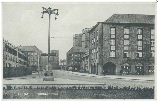 Ein kleiner Tradi in der Stadt. Hier am Industrietor entstanden im Zusammenhang mit der Zusammenlegung der Dörfer (Ockendorf, Rössen) im Jahr 1913 Wohnungen für die Mitarbeiter der Leuna-Werke. Auf der oben abgebildeten historischen Postkarte kann man im Hintergrund der Häuser noch einen der drei hölzernen Rückkühltürme sehen, die bis in die DDR-Zeit Bestand hatten.