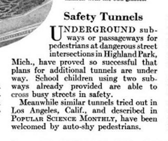 The designs and ideas of these were thought to be so innovative, that in the December 1928 issue of Popular Science (page 72) had a short article about the crossings. The article notes how these crossings helped the auto-shy pedestrians to cross the busy streets safely and that "similar tunnels" had been tried out in Los Angeles, California.