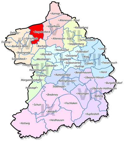 Bergeborbeck (auf Borbecksch Platt Berge genannt) ist ein nordwestlicher Stadtteil der Stadt Essen und in seinem Stadtbezirk der flächenmäßig mit Abstand größte, jedoch einwohnerschwächste. Begrenzt wird er von den Stadtteilen Vogelheim im Osten, Bochold im Süden, Borbeck, Gerschede und Dellwig im Westen sowie den Bottroper Stadtteilen Ebel und Welheimer Mark im Norden. Bergeborbeck ist hauptsächlich geprägt von einer Vielzahl von Industriegebieten, unterbrochen von einfacher Wohnbebauung. Die Namensherkunft des ersten Teiles Bergeborbecks ist in einem Rittersitz der Herren op dem Berge zu finden. Eines der ältesten Zeugnisse im Stadtteil ist das Bodendenkmal des Hauses Horl, einem Rittersitz mit erster Erwähnung im Jahre 1467. Nach mehreren Eignerwechseln, sowie seit 1770 der Zugehörigkeit zum Steeler Waisenhaus, wurde es schließlich 1907 aufgrund der Erweiterung Kruppscher Fabriken abgerissen. Bis heute blieb der untertägige Bereich als Bodendenkmal erhalten. 1808 wurde Borbeck zu einer Bürgermeisterei, wozu auch Vogelheim und damit das Gebiet des heutigen Bergeborbeck gehörten. 1846 erhielt der heute so genannte Bahnhof Essen-Bergeborbeck an der zu dieser Zeit errichteten Bahnstrecke Köln-Minden der Köln-Mindener-Eisenbahn den Namen Berge bei Borbeck, benannt nach dem in der Nähe gelegenen adeligen Rittersitz Haus Berge. Diese Bahnstrecke verlief durch das Emschertal, in dem sich der Steinkohlenbergbau mit zugehöriger Industrie rasch entwickelte. Damit begann eine große Zuwanderung von Arbeitskräften, die die Einwohnerzahl in diesem Gebiet rasant ansteigen ließ. Mit dem Bevölkerungswachstum entwickelte sich Bergeborbeck, so dass auch der Bahnhof um 1900 in Bergeborbeck umbenannt wurde. (Haus Berge und der Bahnhof liegen heute auf dem Areal des Nachbarstadtteils Bochold.) Das größte Stadion Essens war das Georg-Melches-Stadion in Bergeborbeck. Es war das Heimstadion des Fußballvereins Rot-Weiss Essen und stammte aus den 1950er Jahren, in denen der Verein beachtliche Erfolge erzielen konnte. 1956 erhielt das Stadion als erstes der Bundesrepublik eine Flutlichtanlage. Im August 2012 wurde dort das angrenzende neue Stadion Essen eröffnet. Östlich befindet sich ein Autokino, auf dessen Gelände an Wochenenden der größte private Automarkt Europas stattfindet. Des Weiteren gibt es die Turn- und Sportvereinigung 1884/1910 Bergeborbeck e.V., ein Zusammenschluss einer Turnerschaft aus dem Jahre 1884 und der Turn- und Sportvereinigung Jahn aus dem Jahre 1910. Quelle : Wikipedia