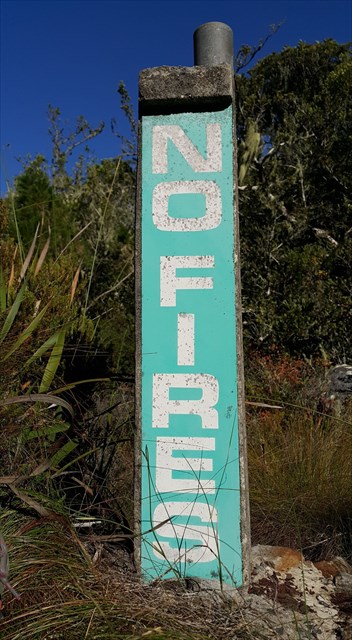 The cache site is near an old campsite on top of Table Mountain and the only indication that people were once allowed to camp there is an eerie warning sign stating "No Fires".