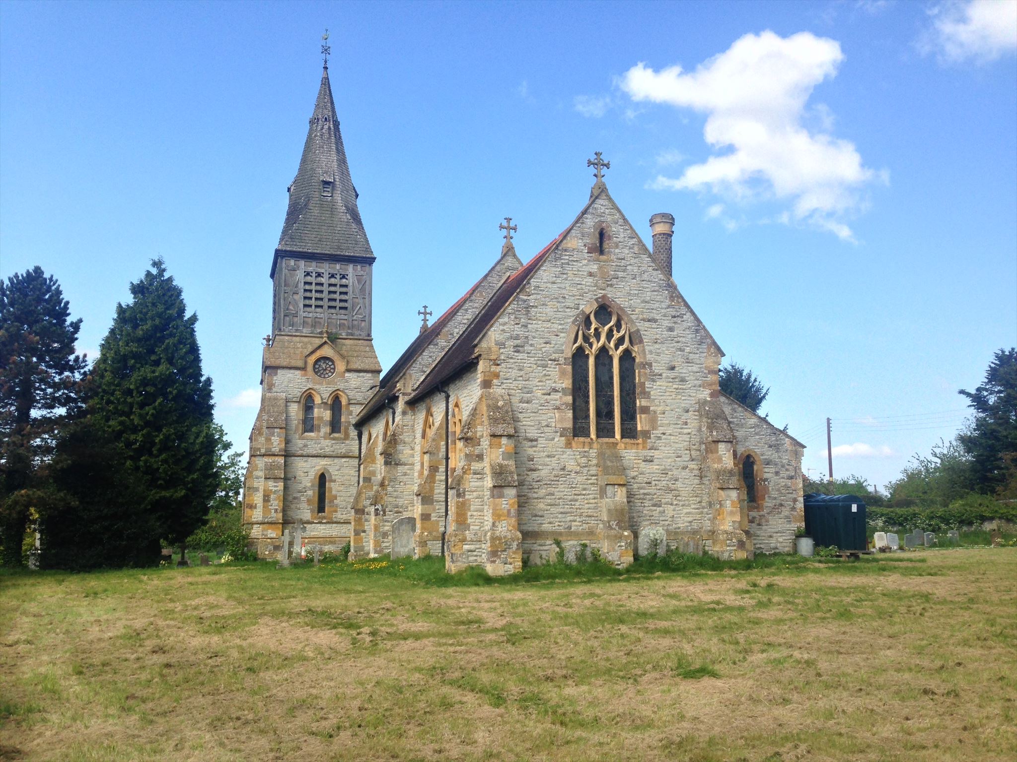 The church of St Andrew's at Temple Grafton dates from 1875 and is an attractive example of Victorian church architecture, the work of architect Frederick Preedy (who also designed stained glass, including the east window here). The south west spire is particularly distinctive, with it's timber-framed belfry storey. .