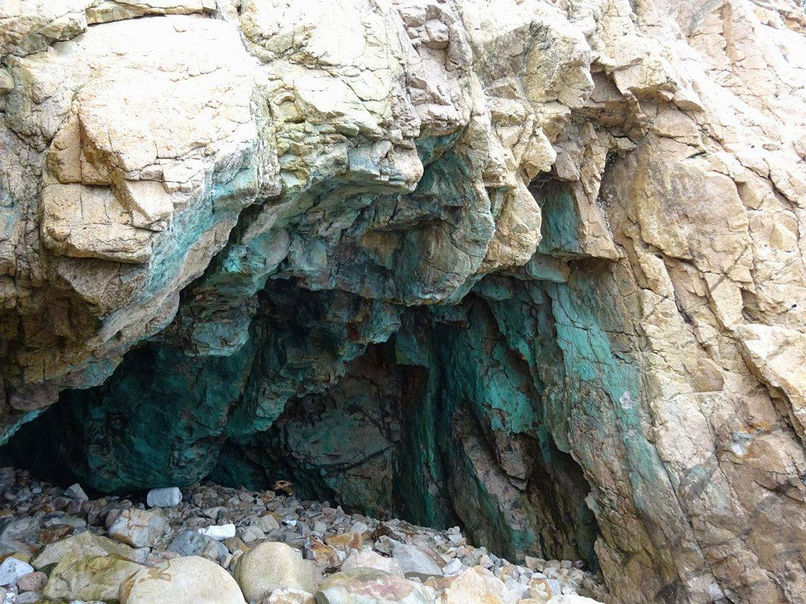 Obseve the green rock in the cave.