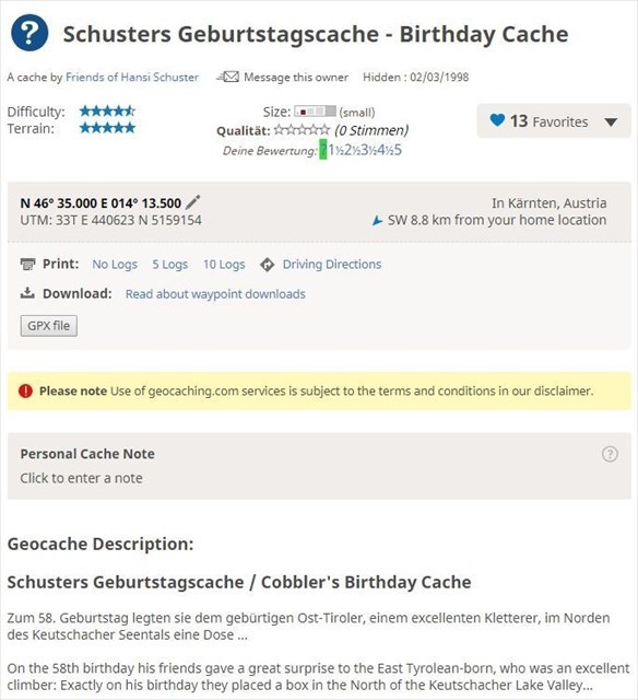 On November 6th, 2018 I have been contacted by Geocaching HQ. I was asked to edit my listing because of statistical reasons. As the mystery would not be solvable after modification, you get to see a screenshot of the former version.
