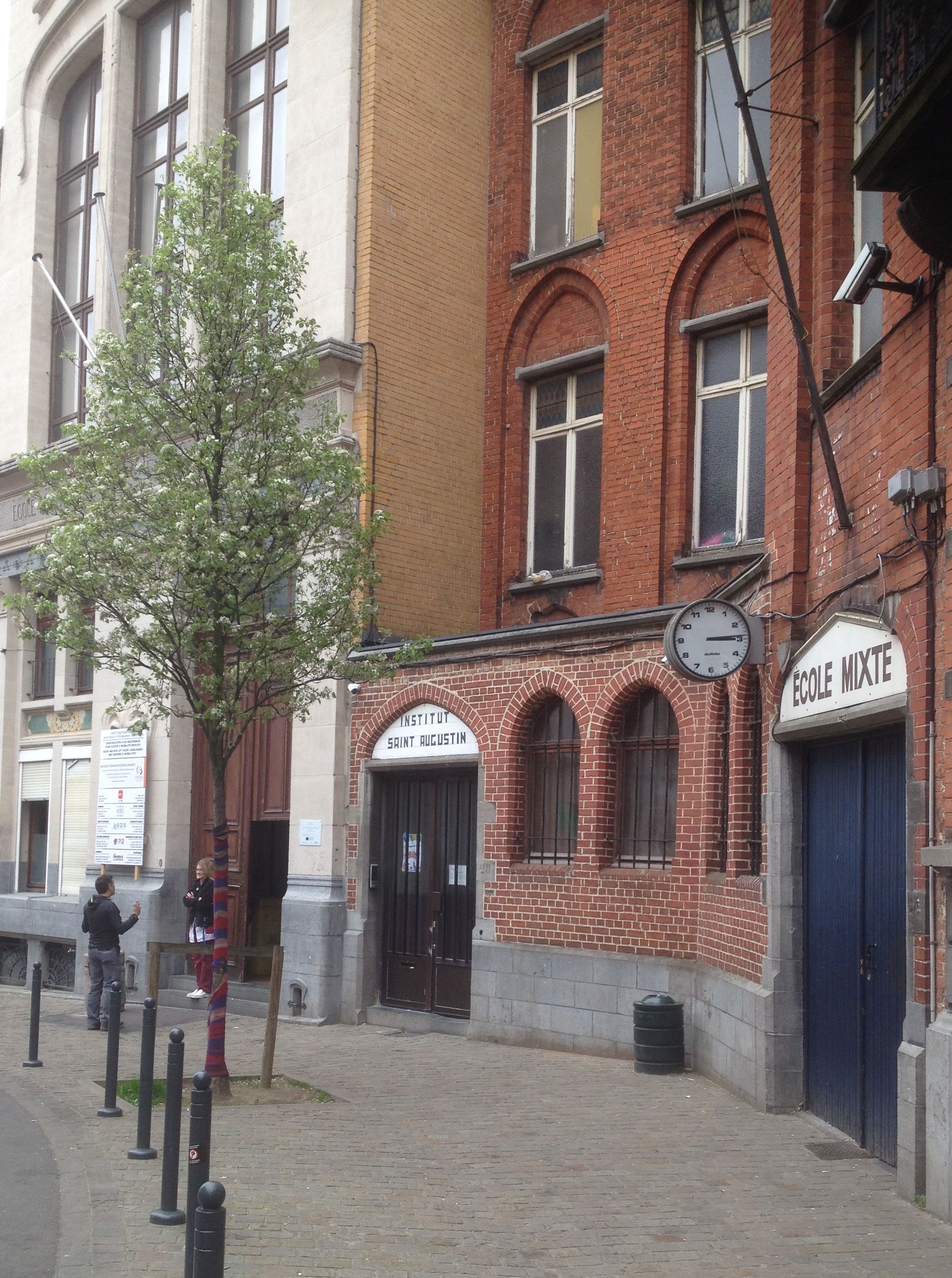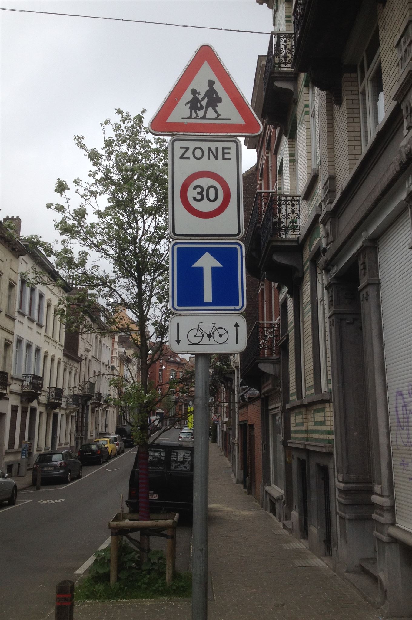 Some time ago, there were graffitis here and there in the street. They have now almost disappeared. Here is a enigmatic example of it, as well as a view of the two schools and the associated speed limit signs.